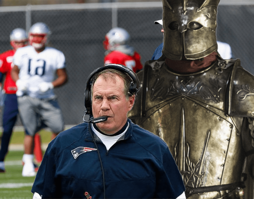 Rumors had indicated Gronkowski may stay away from voluntary practices due to his contract status and health concerns. Reporters assumed the monstrous 6’6” tight end would leave a large hole to fill, but the spectacle on the field Tuesday suggested the team is ready. A behemoth towered behind Coach Belichick when he addressed players at the beginning of practice. Later, the silent colossus backed up his intimidation on the field: Gronkowski is known to break tackles, but the hulking brute nearly broke a neck. After catching a pass with one gauntleted hand, he halted Dont’a Hightower’s charge with the other and lifted the 270-pound linebacker up with a choke-hold. He spiked the ball after coaches intervened.